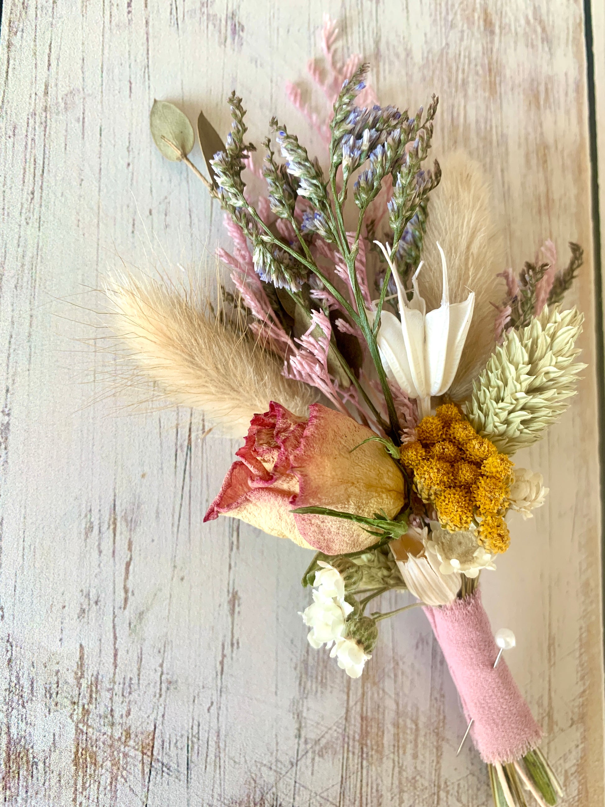The Lelant buttonhole is a gorgeous selection of dried flowers which look stunning on the wedding parties lapels. These beautiful boutonnieres offer a beautiful mix of pastels and yellow, giving the perfect English country garden vibe.